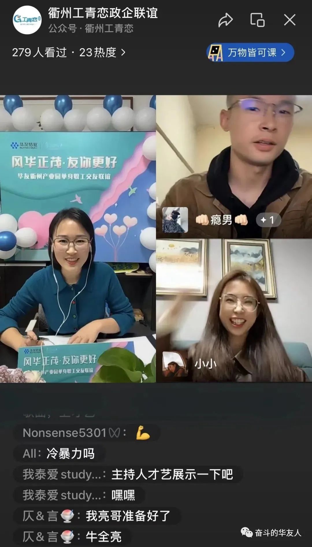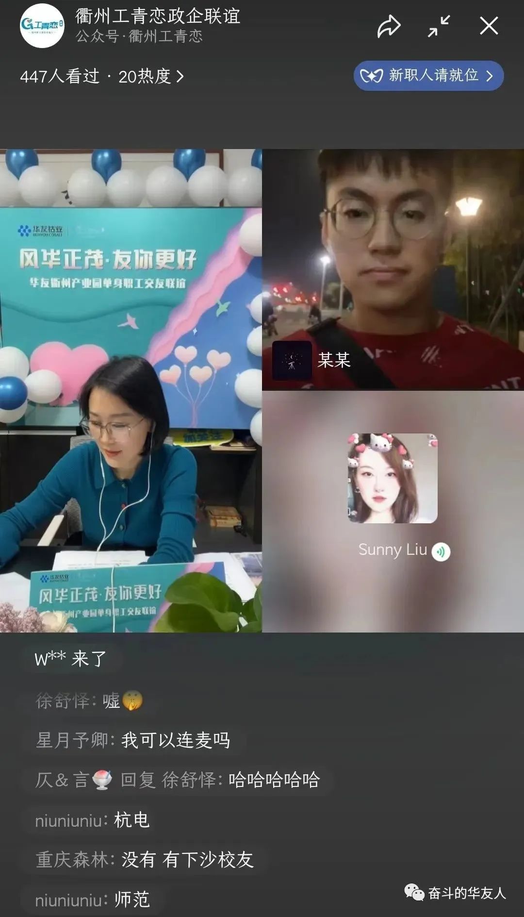 10ÔÂ29ÈÕ19:00 ¡¶¡°Ôµ¡±À´ÊÇÄã¡·ÏßÉÏÁµ°®Ö±²¥¼ä¿ªÆôºó£¬±ãÓÐ200ÓàÃûÖ»ÉíÄÐÅ®±¨ÃûÓ¿Èë¡£Ö±²¥¼äÄÚ£¬Ö÷³ÖÈËÒÔÏÖ³¡»¥¶¯¡¢×ÊÁÏչʾ¡¢ÍøÂçÁ¬Ïߵȷ½·¨£¬Ö¸µ¼Ö»ÉíÖ°¹¤ÃÇÔÚÏßÉÏÖ±²¥¼ä³ä·Öչʾ×ÔÎÒ£¬¿ª·¢ÁËÒ»ÌõȫеĽύÇþµÀ¡£Í¬Ê±£¬Í¨¹ýÖ±²¥Áª¶¯¡¢±íÐÄÒâ¡¢¼ÓÖ¿ÓÑ¡¢ÈºÁÄ»¥¶¯¡¢ÐĶ¯Ôµ·ÖǽµÈÏßÉÏÏàͬģʽ£¬È¡µÃÁ˸ü¶àͬÁäÖ»ÉíÈËÊ¿µÄ¹Ø×¢£¬×èÖ¹Ö±²¥¿¢Ê£¬ÀۼƼÓÈëÈËÊý´ï490ÓàÈË£¬ÓÐÀû½â¾öÁËÖ°¹¤Òòʱ¼ä¡¢½»Í¨¡¢µØÇøµÈÏÞÖÆ£¬×谽ύµÄÎÊÌâ¡£